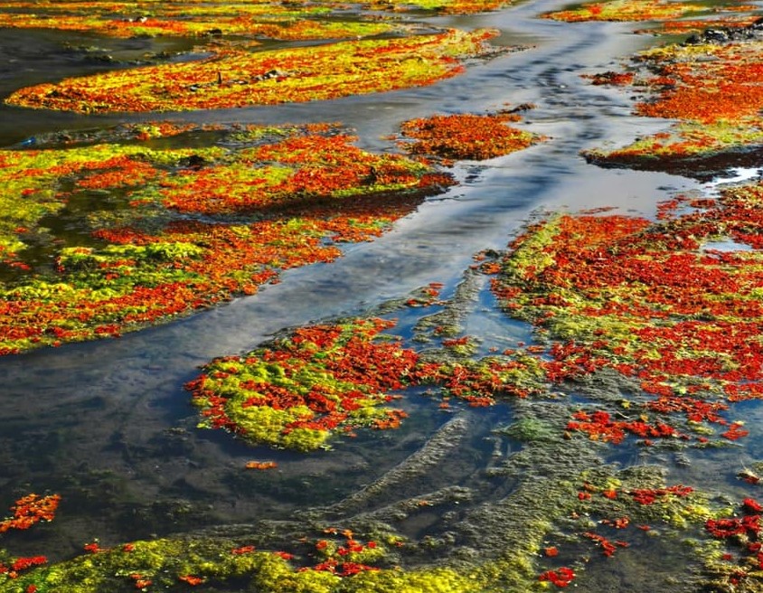 ●【滿江紅】南投仁愛武界部落的濁水溪河床每逢冬、春之際枯水期,「滿江紅」等水生植物遍布溪床邊,更因低溫變色,紅、橘、綠等色彩如抽象畫般漂浮在水面上,享「上帝的調色盤」美譽,這季節限定美景近期現蹤,吸引遊客朝聖,預計持續至3月。